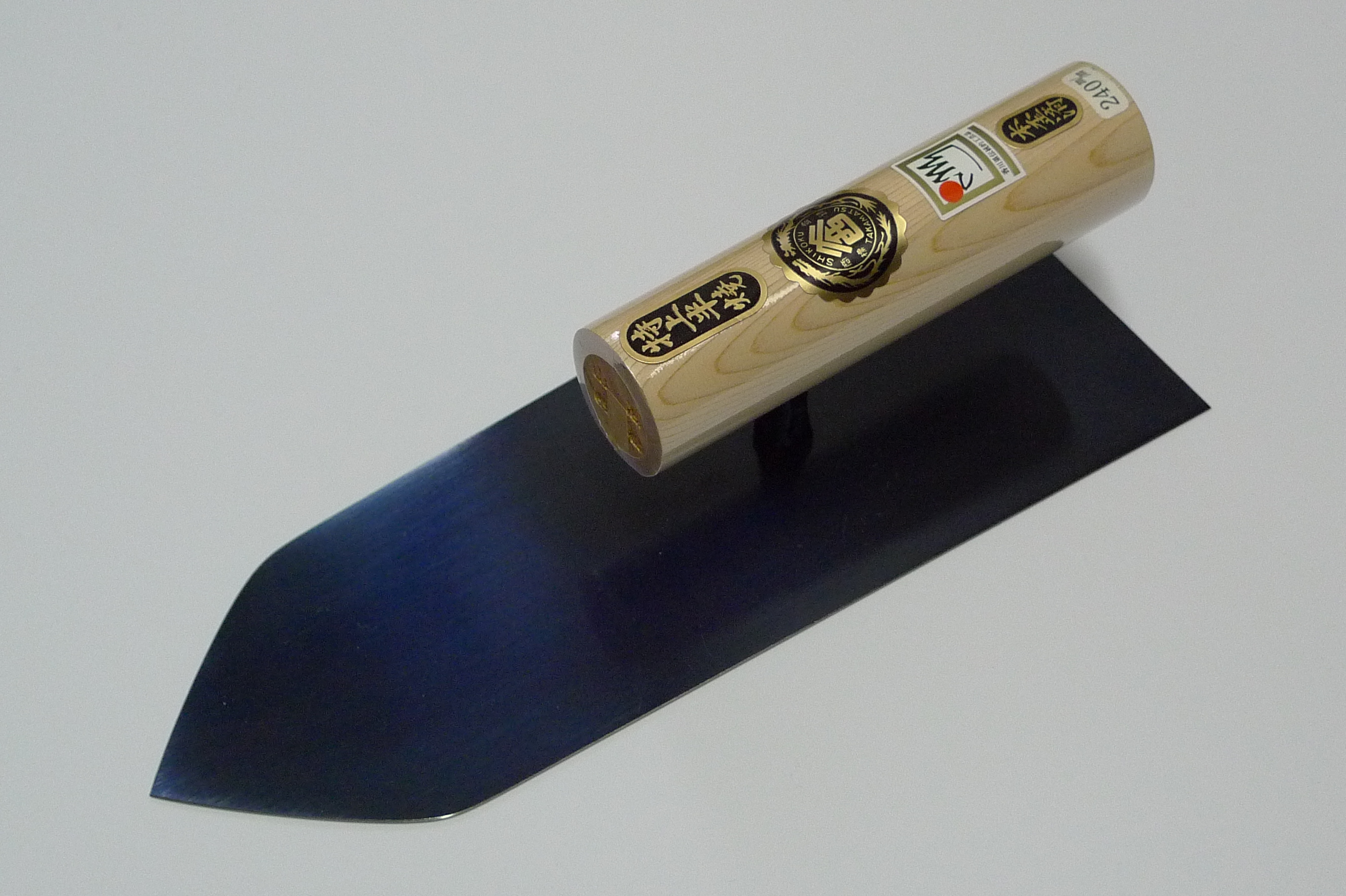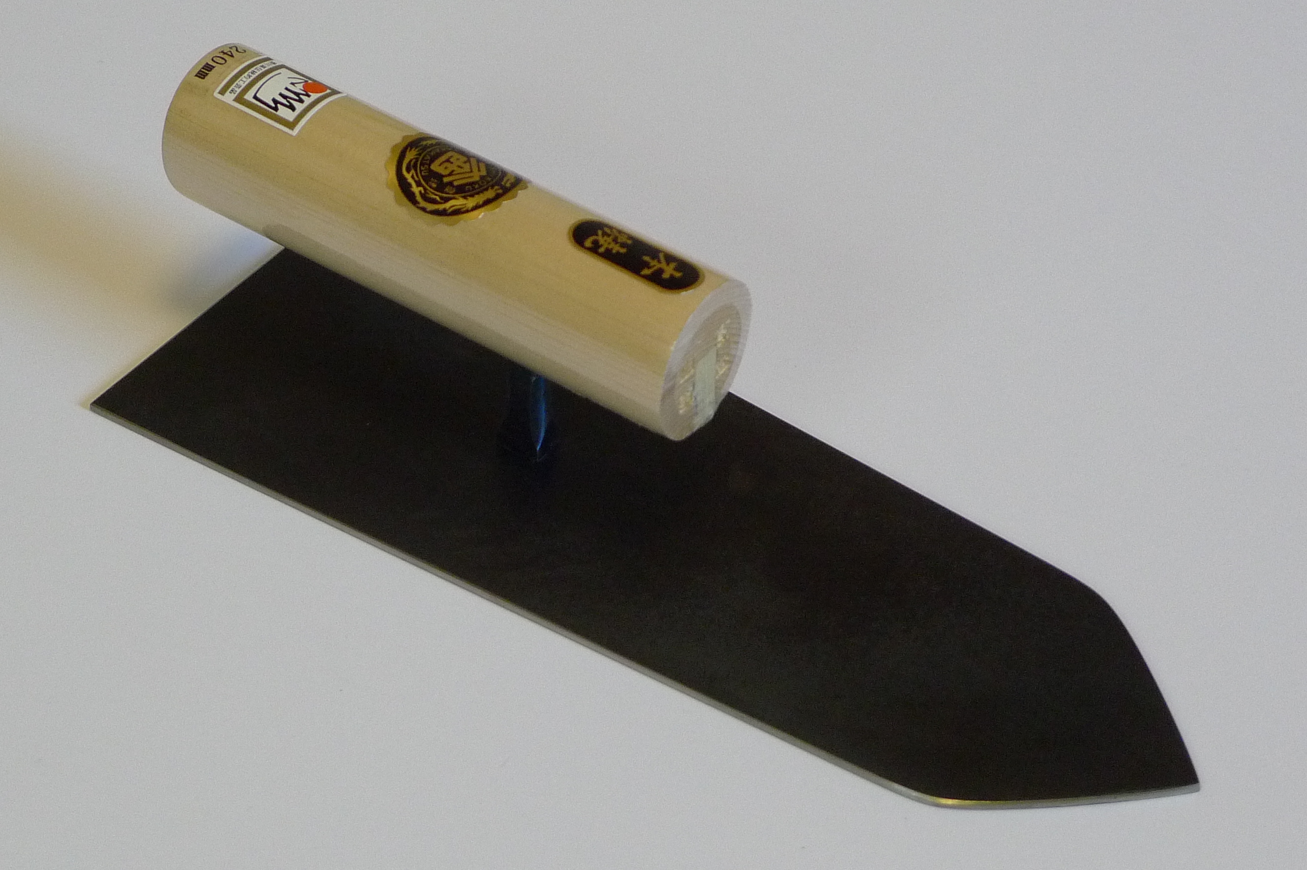 Hard, thick honyaki steel used for compressing cement based plasters for a Terrazzo or exposed aggregate finishes.